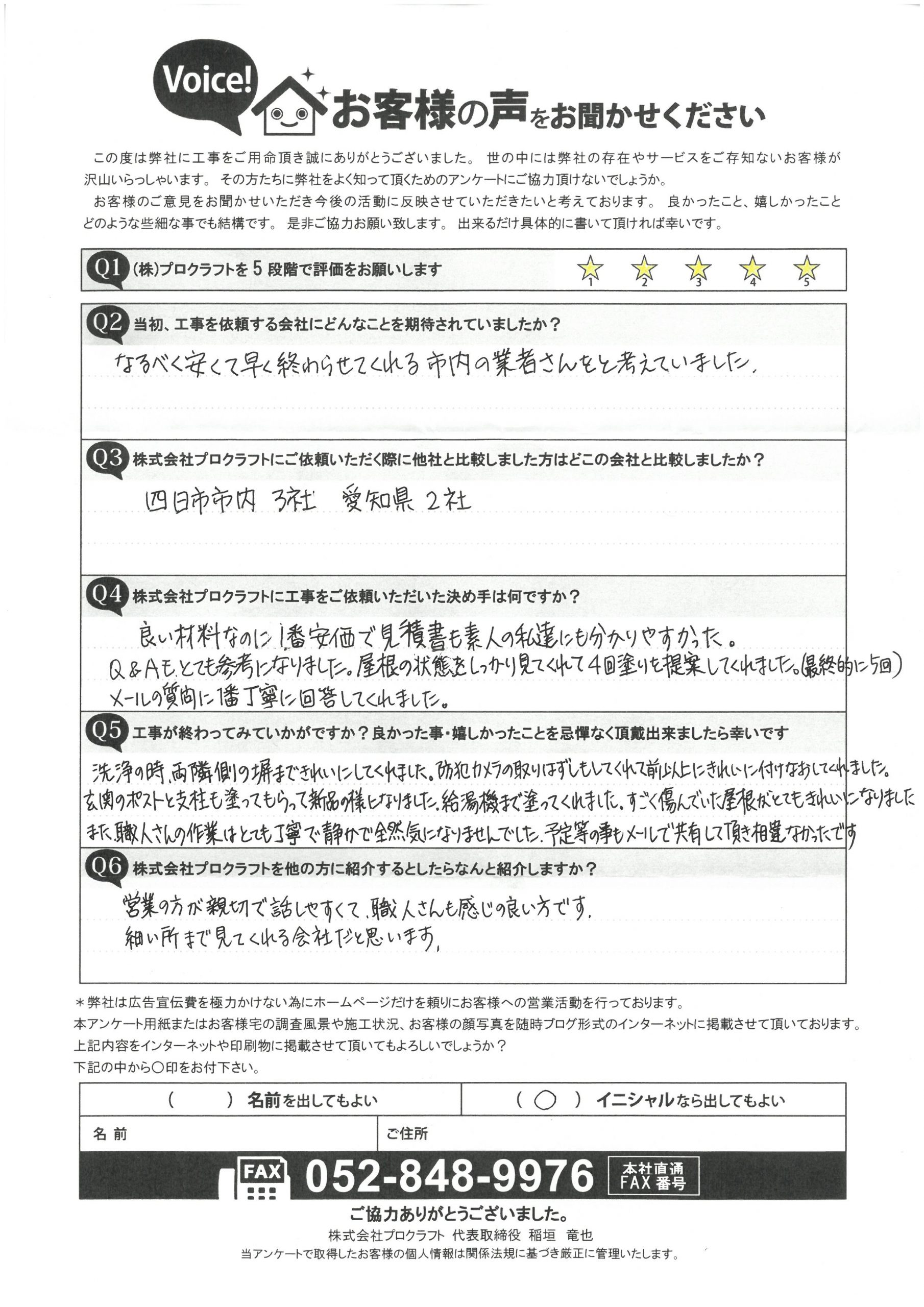 四日市市で無機塗料で外壁塗装させて頂いたH様のお客様の声です!